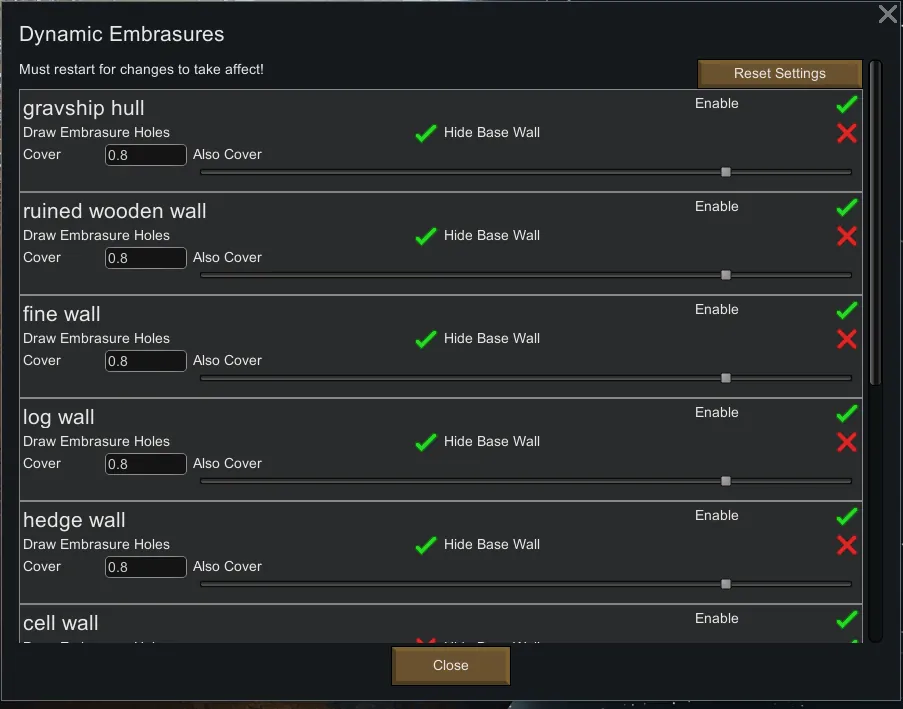 Creates walls that you can shoot through for any modded wall added to the game. It does so by dynamically creating embrasure versions of all walls on load. This does create a instance where you can have a hedge embrasure, if you have a mod that adds a hedge wall to the game.