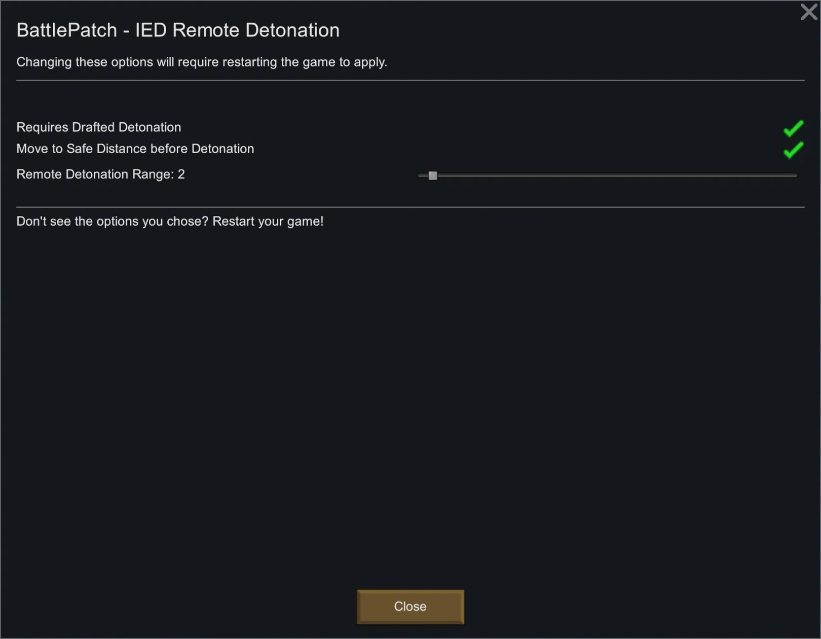 This mod adds a button to all IEDs that allows you to detonate them at any time. Alternatively, has an option to require a drafted pawn to detonate them. The pawn will move near enough to the IED (distance can be changed in settings) to detonate it, and there is also an option where they will not detonate it if they are in danger of being harmed by the explosion. Finally, there is an option to only have this functionality enabled after Microelectronics is researched.