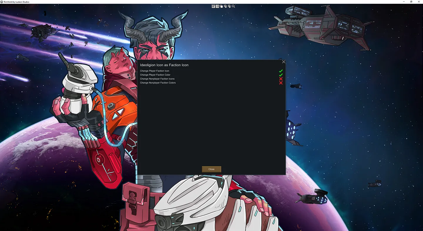 Tired of the same old boring settlement icons and faction colors every game? Now you can make your settlement icon match your ideoligion's icon! And color. And also you can enable/disable the same thing for other factions on the map.