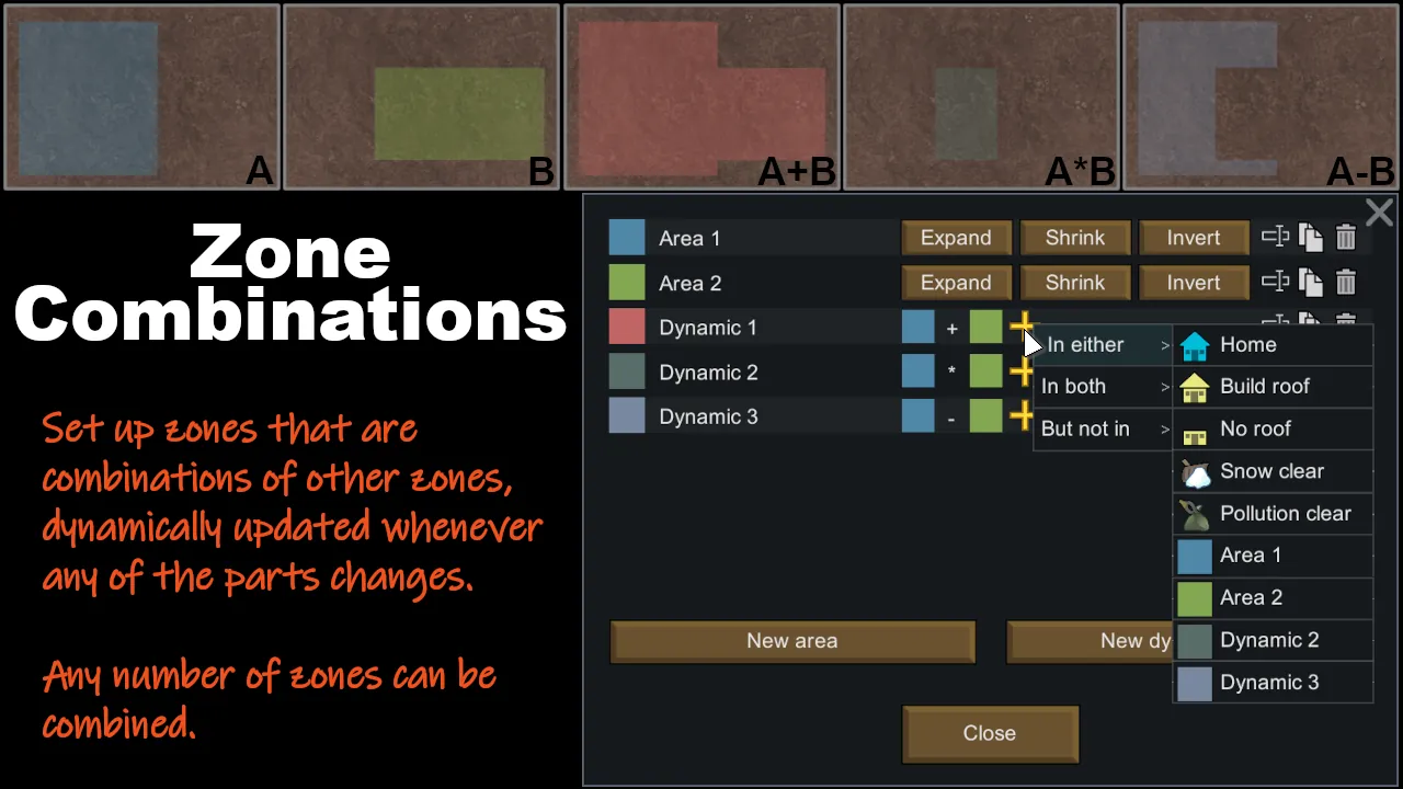 Set up allowed areas that are combinations of other zones, dynamically updated whenever any of the parts change.