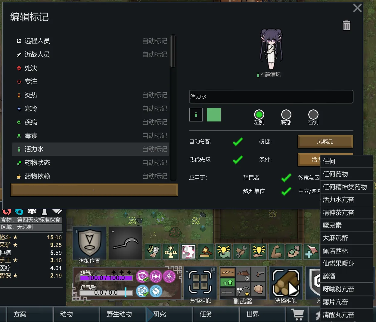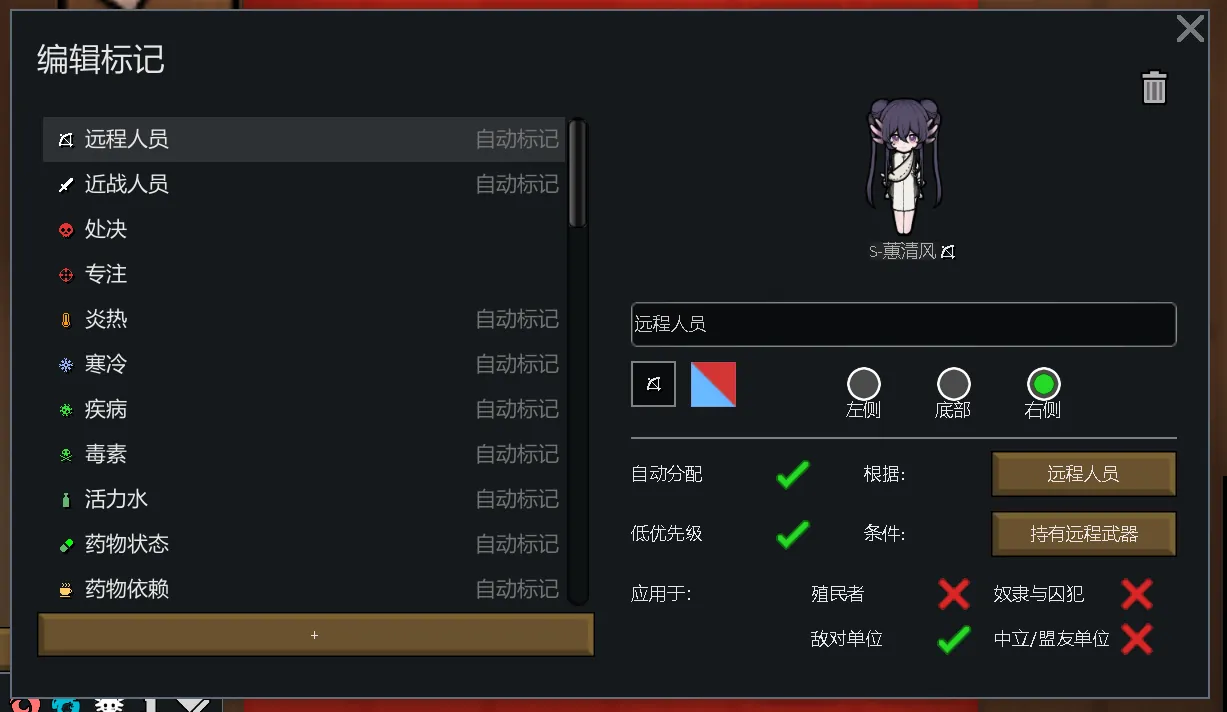玩家可以为每个图标标签定制复杂的自动赋予规则。选择适用人群(殖民者/奴隶囚犯/敌对单位/中立盟友),并设置精准筛选条件。