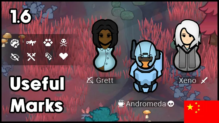 该模组可以为地图上的所有单位(殖民者、奴隶、囚犯、敌人、盟友等)智能添加直观的图标标记。效果如图片所示: