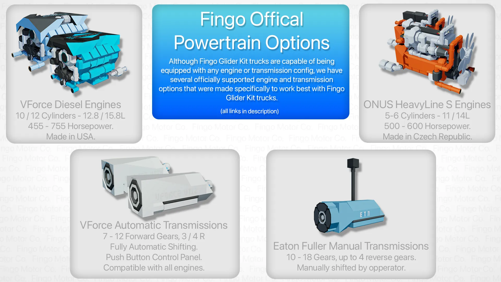 Fingo Glider Kit trucks come without an engine or transmission, and can be configured with any engine or transmission that suits your trucking needs best. Fingo recommends [url=https://steamcommunity.com/sharedfiles/filedetails/?id=3230634384]VForce Diesel Engines And Transmissions[/url] or our engine partner [url=https://steamcommunity.com/sharedfiles/filedetails/?id=3542458505]ONUS HeavyLine Diesel Engines[/url].