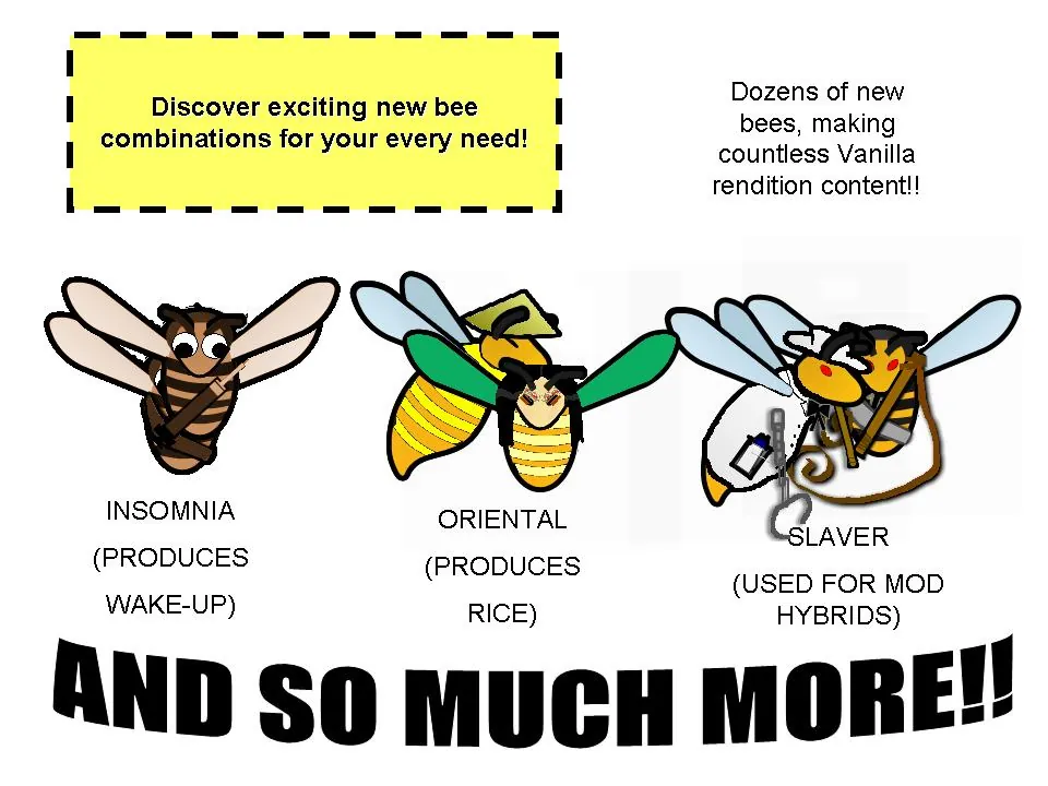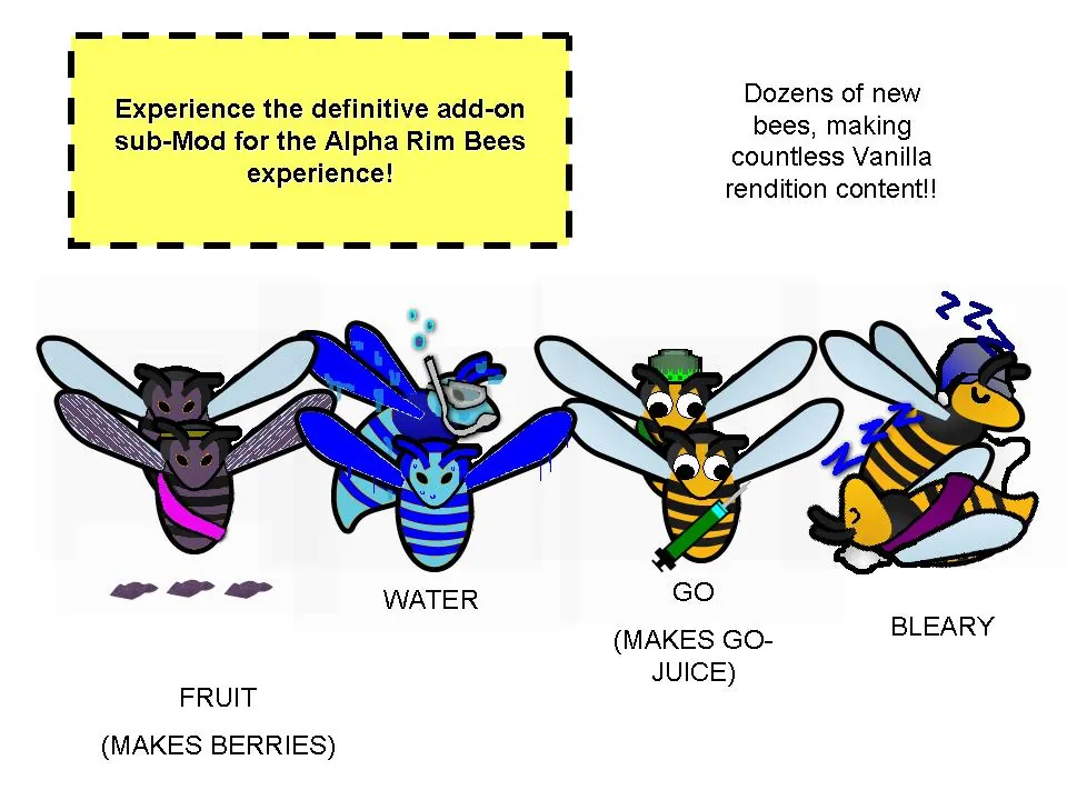Based on the world-famous [url=https://steamcommunity.com/sharedfiles/filedetails/?id=1558161673]ALPHA RIM BEES MOD[/url], this sub-Mod adds [b][i]OVER THIRTY-FIVE NEW BEES[/i][/b]* for you to explore and breed, with support for multiple Mods and items! Experience bees that produce rice, bees that produce water, bees that produce Wake-Up, Bees that produce Go Juice, and so much more!