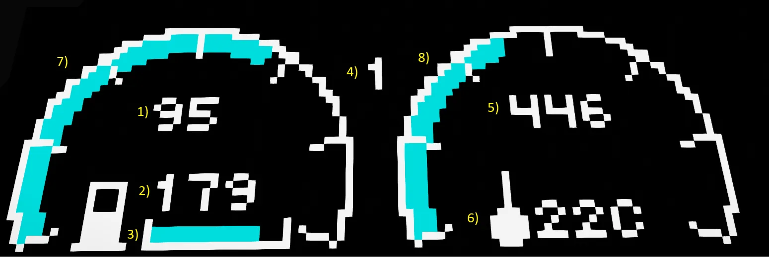 - Gear {number} (Current gear. If -1 it will display "R". If 0 then it will display "N". Else will display number)