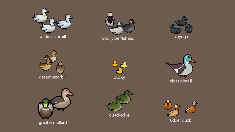 Diversify your ducks! Adds ducks for all occasions, including predatory ducks, haulers, pack ducks, pet duckies, and ducks with woolly down.