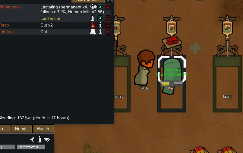In addition, medicine can also be put into the infuser. When medicine is loaded, it will continue to improve the tend quality of tended wounds until it reaches the maximum quality of the loaded medicine. Improved quality will be shown in green text. [b] It will not automatically tend wounds! [/b]