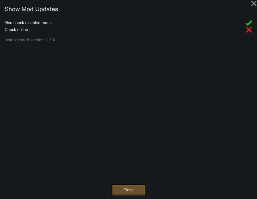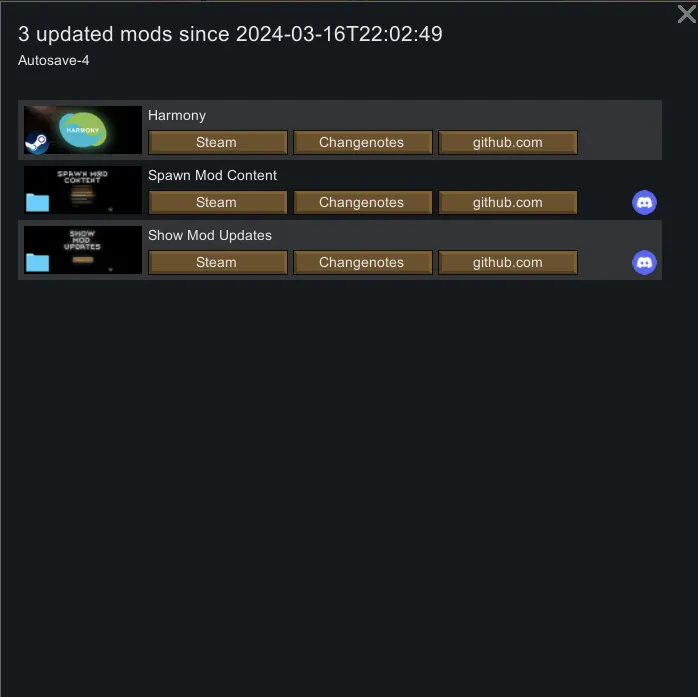 If any of the active mods have changed you can show a list of these with convenient links to the Steam, changelog or any other defined link of the mod. If there is a Discord-link in the description, a link will be shown in the list. There is also an icon indicating if the mod is in the local mod-folder or the Steam-folder.