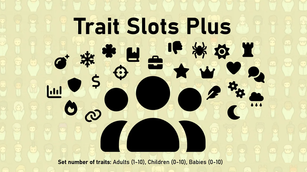Get more control over the way traits are handled in the game. Choose numbers of traits generated for characters - adults and babies - or choose not to have any traits at all. Have lots for adults and, yes, none for babies, it you want! Also, set probabilities for each allowed numbers using the mod settings.