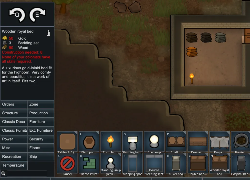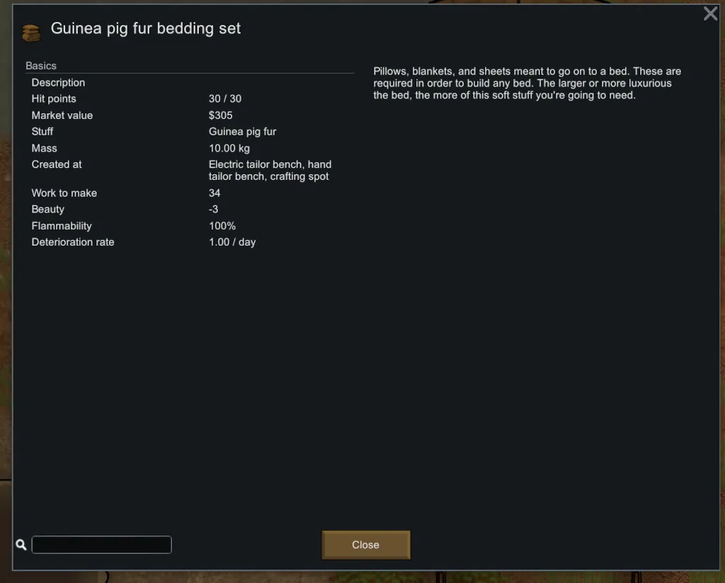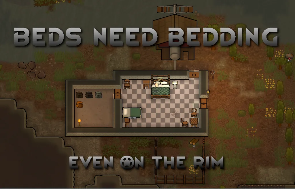 This simple mod makes any bed you build require Bedding, such as pillows, blankets, sheets. Bedding is simply a new resource you make at the crafting spot, or tailoring tables out of cloth or leathers. I made this as focused on the point as I could. There's no differing qualities to any of the types of bedding you make. If you want to, you can make Thrumbo fur bedding or Lizard skin bedding; they will act the same.