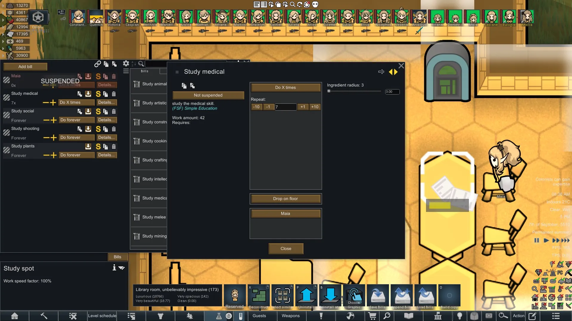 The total amount of XP a person gains from a single bill however is based on their passions, so it could be less or more. The speed at which they complete a study bill is based on the Studying Speed Stat. This stat is based on Global Learning Speed and Consciousness. So, a genius will study much faster than a regular person. Likewise, someone with a low consciousness for whatever reason will study much slower.