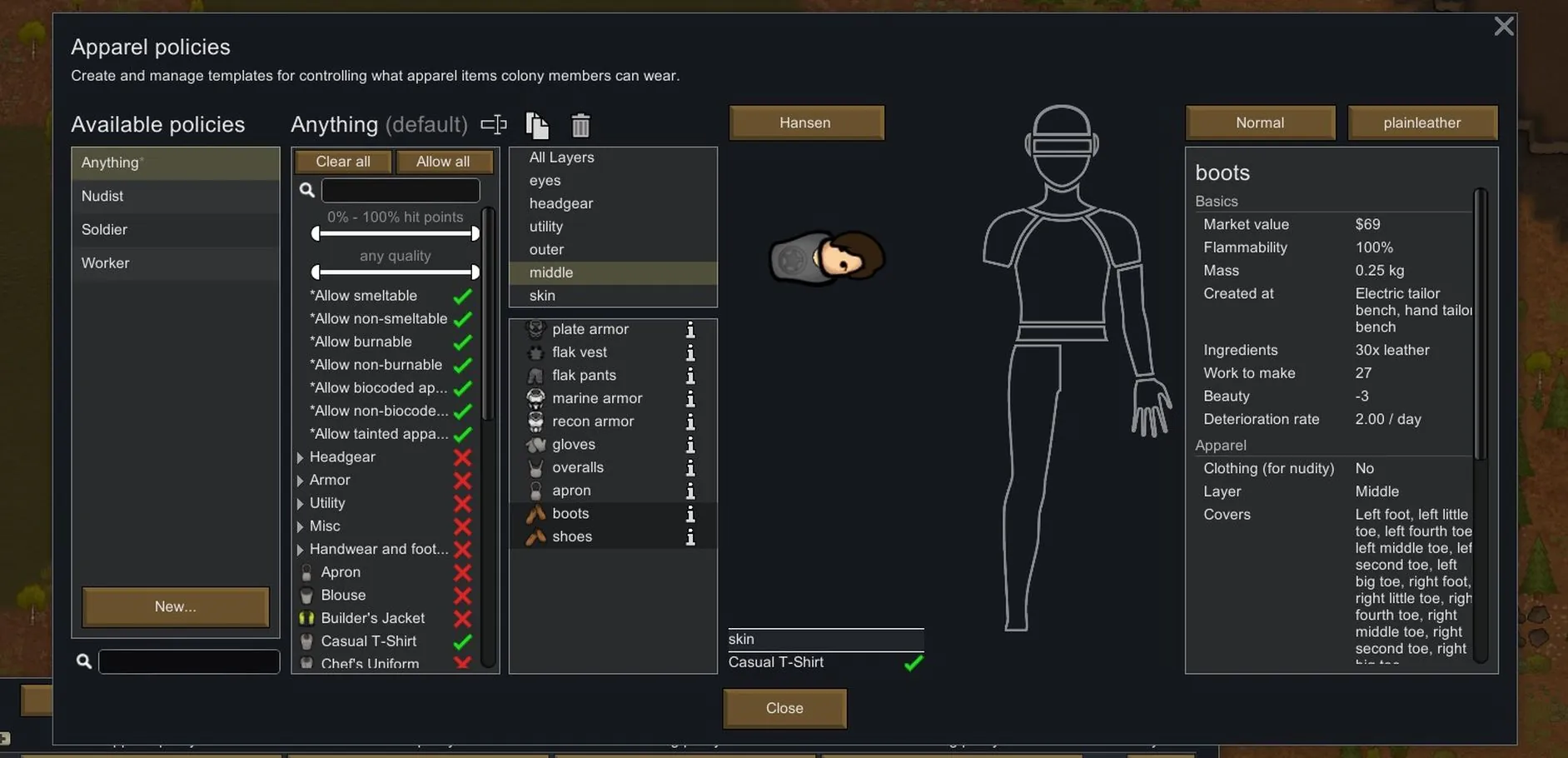 [*] Right-clicking on an apparel with a pawn selected on the map adds a menu to add/remove apparel to/from the pawn's current policy.