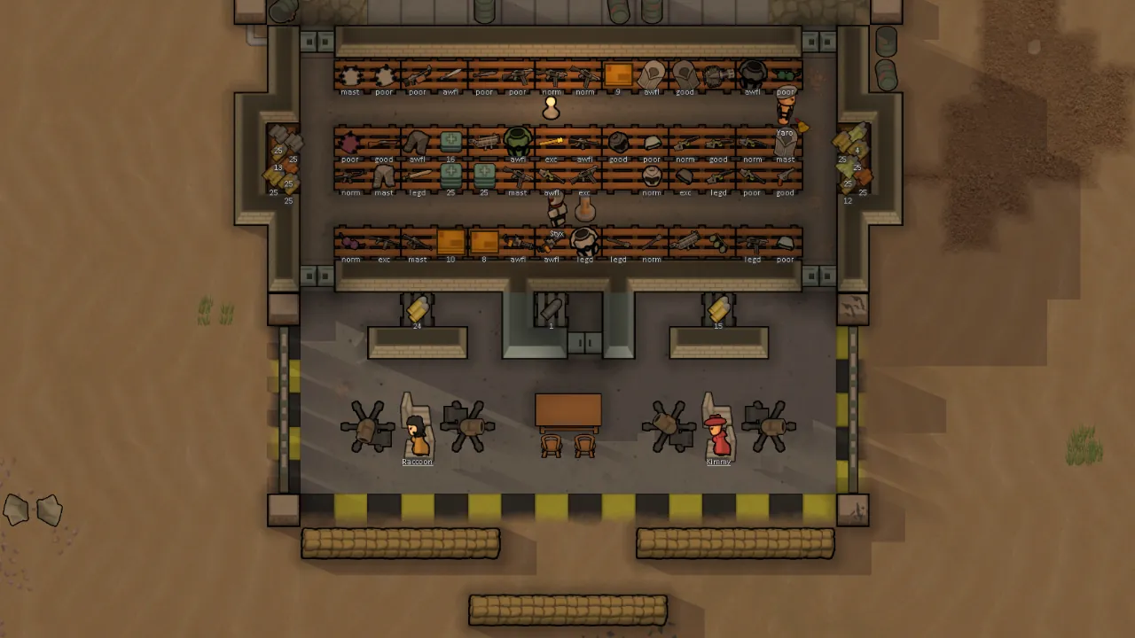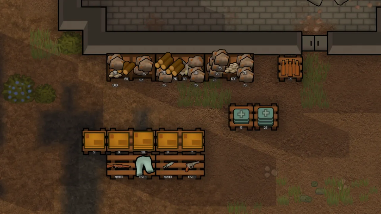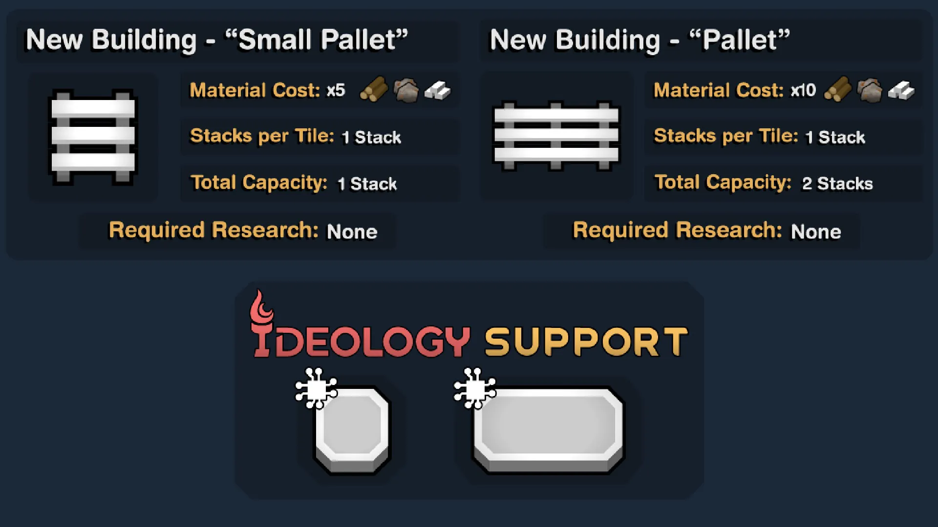 Practical Pallets adds two new buildings to RimWorld, a regular ‘pallet and a ‘small pallet’. These function like shelves but, they can only store one stack/thing per tile (as opposed to three.)