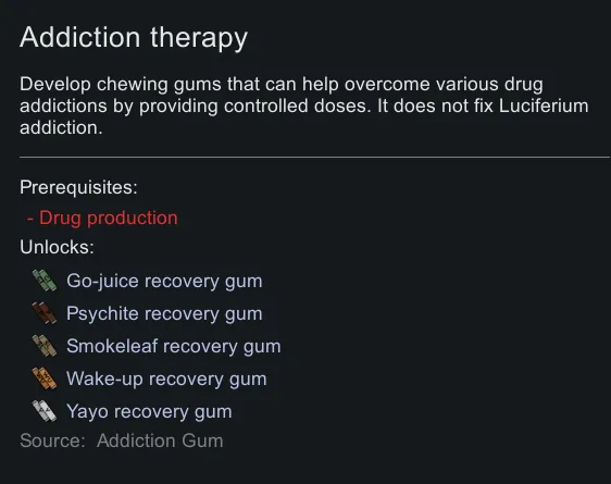 This mod adds craftable chewing gums that can remove addictions for Psychite (Flake, Psychite Tea), Wake Up, Yayo, Go Juice and Smoke leaf. Think Nicotine gum but for hard drugs.