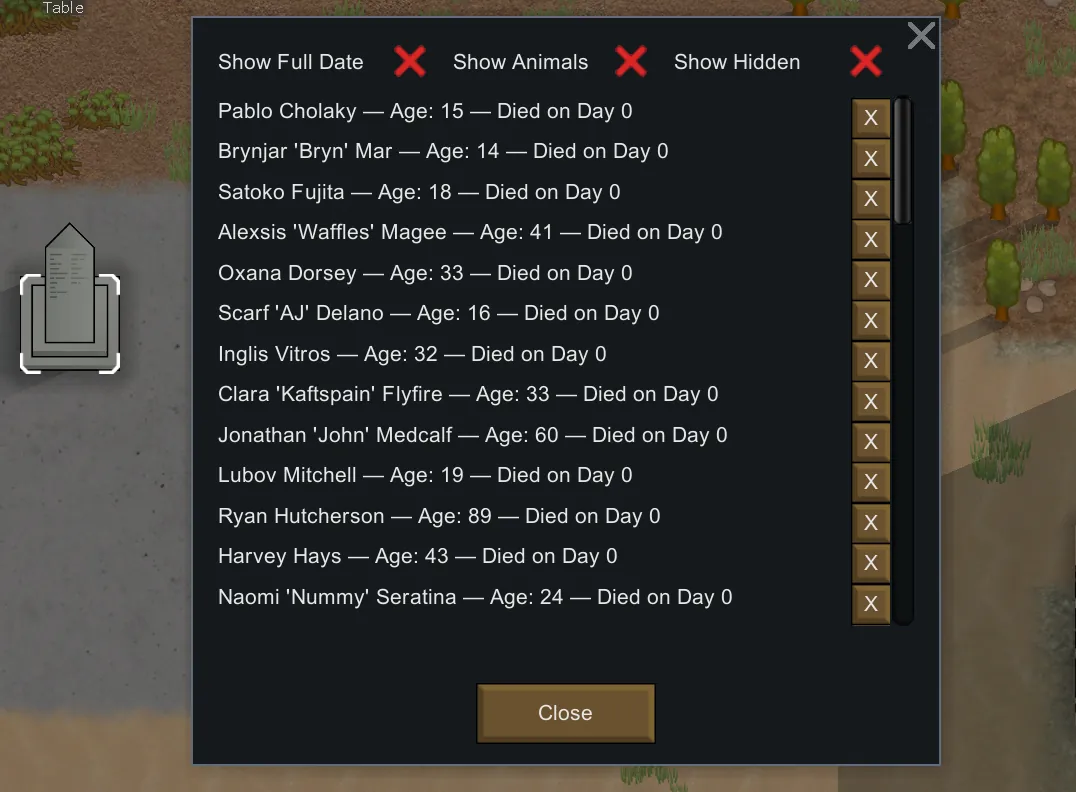 This mod adds a Memorial Obelisk building that lists all deceased colonists, their biological age at the time of death and which day they died on. If a pawn is resurrected, they will disappear from the list.