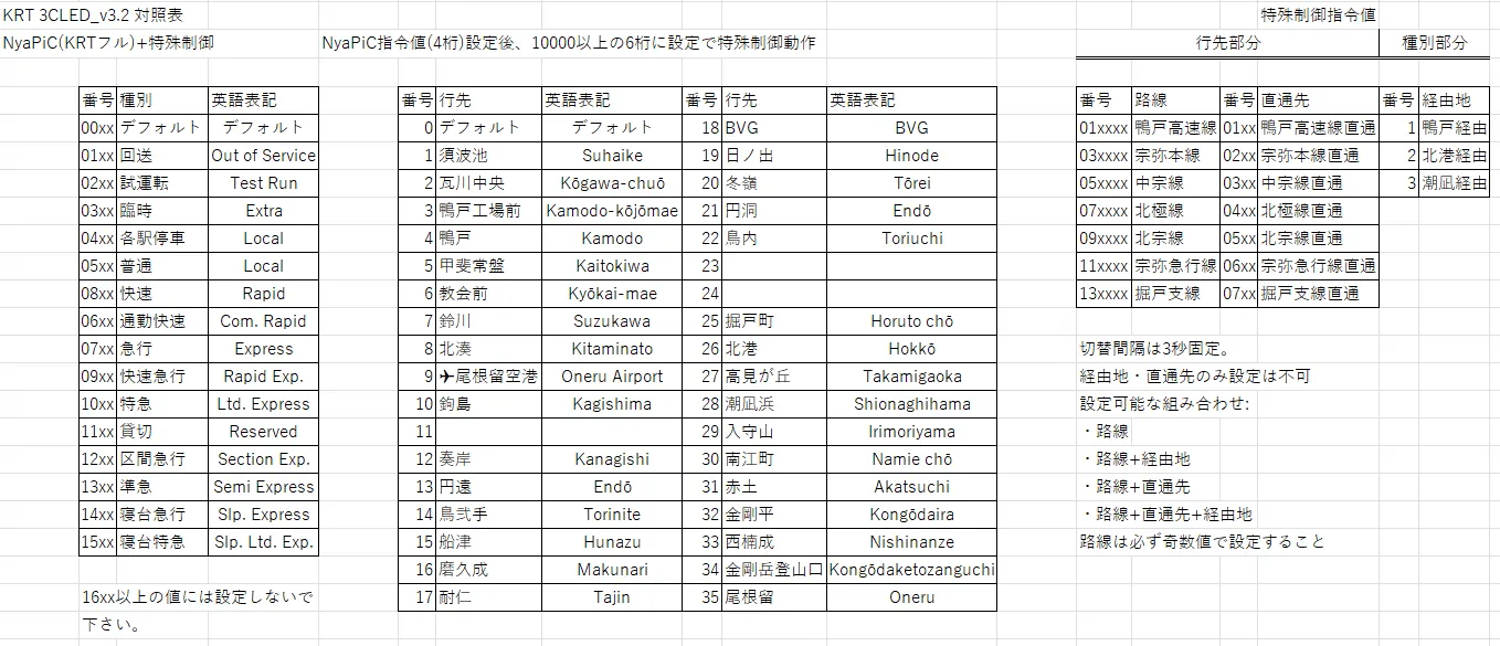 JR風3色LED表示器です。2*1と3*1のモニタ又は3*1のモニタ又は1*1と2*1のモニタを使用します。列番・運番は出せません。 是非組み込んでご使用下さい。 (スクショは表示例です) v3.1からの変更点 ・種別と行先が上下に1pxずれていたのを種別を上に1px移動する事で修正しました。 ・西楠成、金剛岳登山口を追加。尾根留(無印)を復活させました。 ・掘戸支線表示を追加しました。