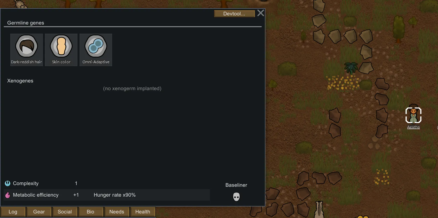 Because starting pawns and world-spawned colonists typically do not have parents assigned, their alleles are randomly generated. Both values will be rolled between 0.1 and 0.5, ensuring they always have some capacity for growth.
