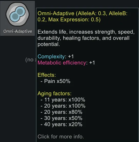 Each pawn with this gene carries two allele values, each ranging from 0.0 to 0.5. The total of both values determines the pawn’s genetic potential, which defines the maximum power level (or gene expression) the pawn can reach.