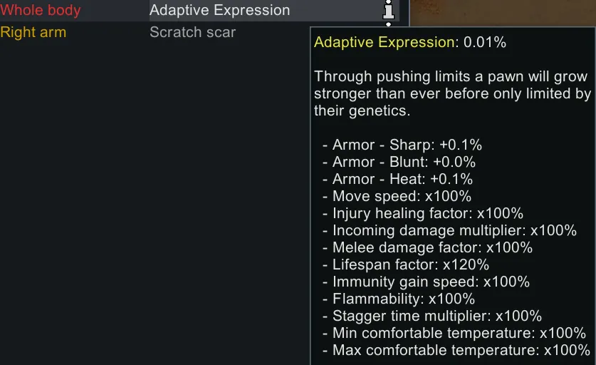 This gene includes a built-in mechanic called the Adaptive Stress Meter. It is an invisible meter that tracks a pawn's exposure to physical stress from combat. It determines when and how much gene expression growth is triggered.