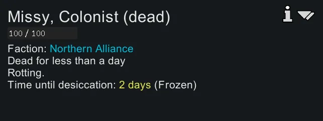 It also notes if the corpse is currently refrigerated (slowing down the decomposition process) or entirely frozen (stopping it completely). Don't forget that desiccation is naturally sped up by higher temperatures!