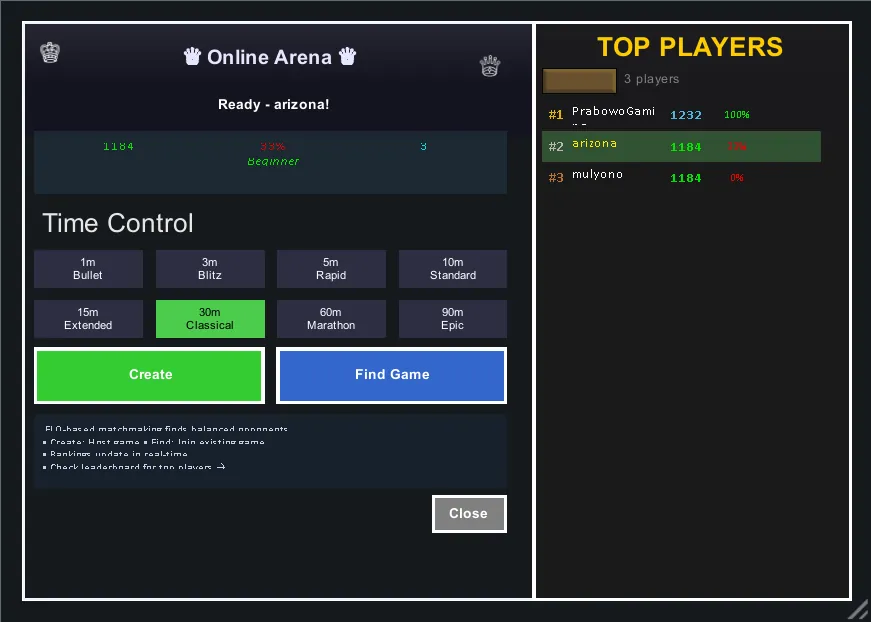 Connect to the server and face opponents from across the rim. Features real-time matchmaking, ELO ratings, and the crushing realization that someone on another planet is better at chess than you.