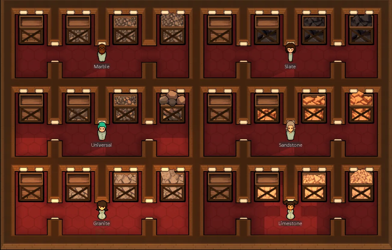 Petit bonus : la texture des caisses change selon la quantité de ressources stockées — vide, partiellement pleine ou remplie à ras bord.