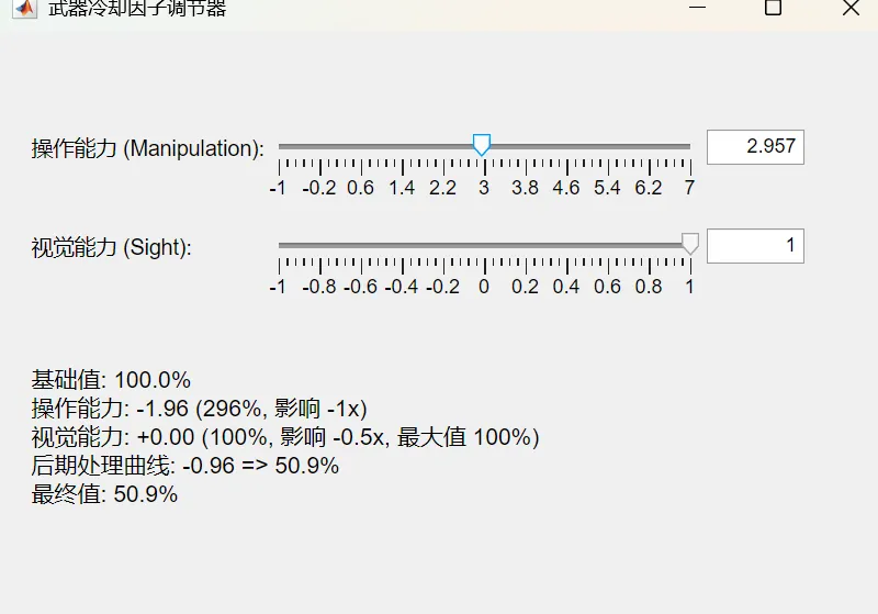 为此我的二创模组代码为了适配VOID,改为了1000%操作能力下动态冷却时间系数有20%,而且上限也是20%。但500-600%操作能力下,冷却趋向于33%%。对玩家来讲强度合理。我还附加matlab程序,用于游戏外计算动态冷却时间系数,如果你们有matlab的话。
