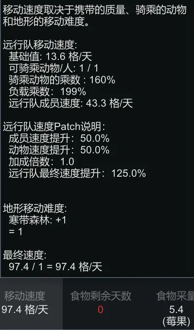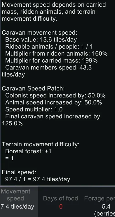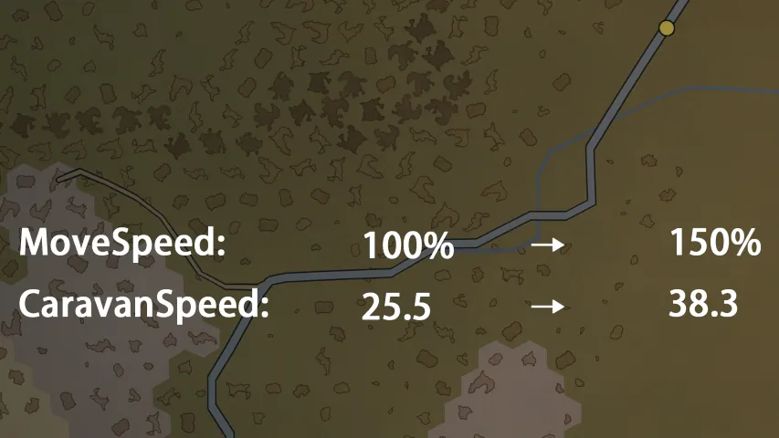 Increases caravan travel speed when there are members with [u] [b] above 100% [/b] [/u] move speed. If multiple such members exist, their bonuses are averaged — similar to the logic used for mounted animals. The speed bonus is configurable.