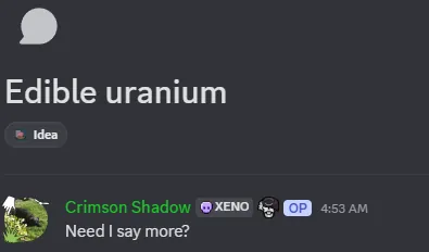 "Edible Uranium, Need I say more?" - Crimson Shadow