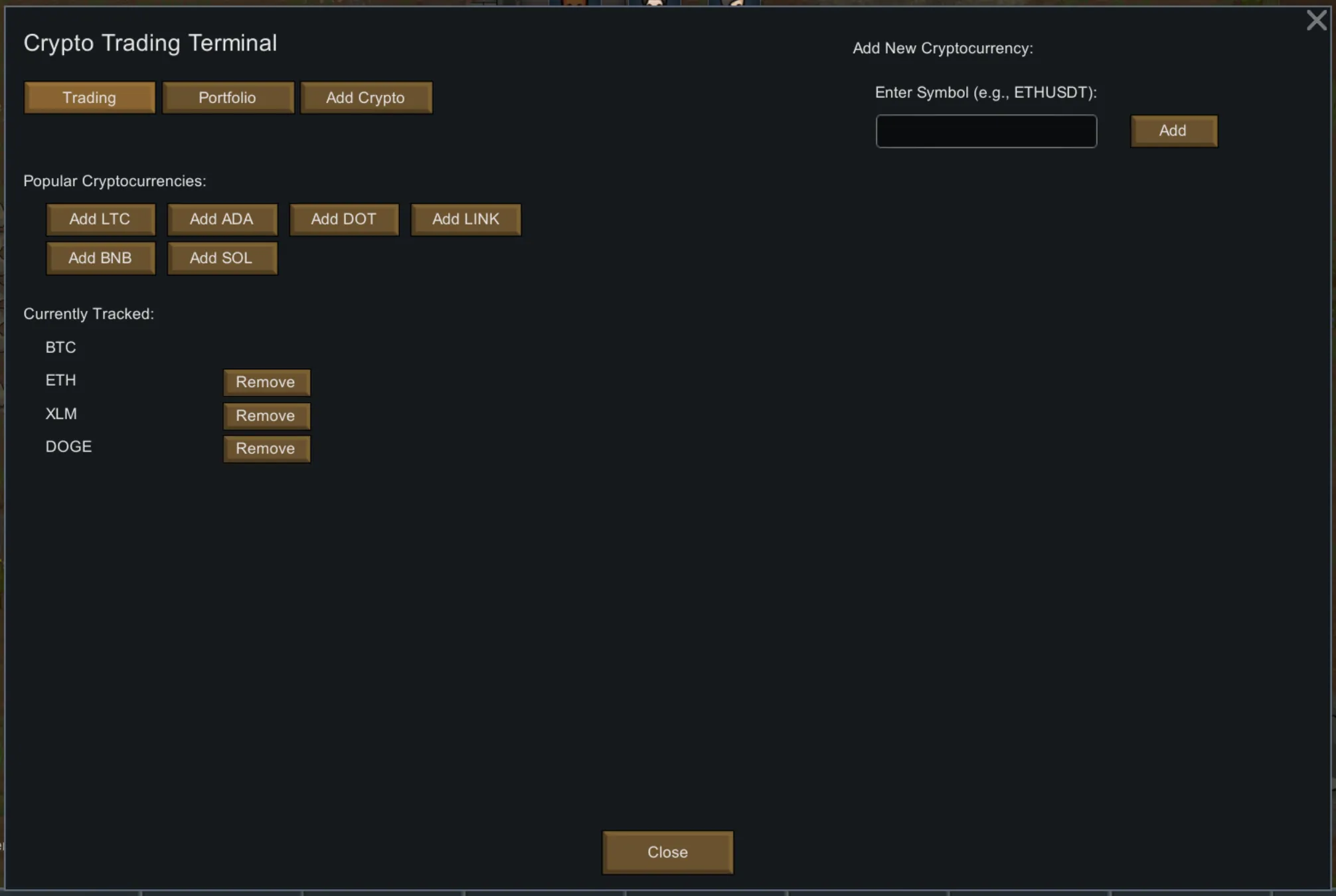 [*] [b]Multiple Cryptocurrencies[/b] - BTC, ETH, DOGE, and even more, You can type the symbol but add USDT! (example: WIFUSDT) Diversify your losses like a pro!