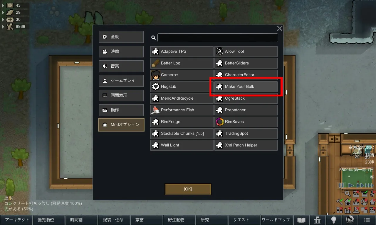 スタート画面で「設定」を開き「Modオプション」の中の「Make Your Bulk」に移動してください。