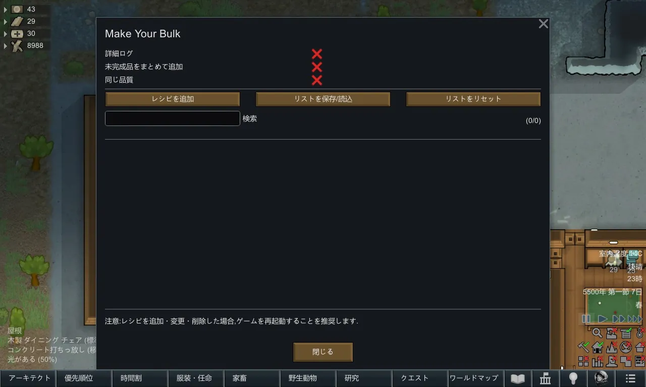 [*] [b]リストをリセット[/b]:すべてのバルクレシピをクリアします(再起動が必要)