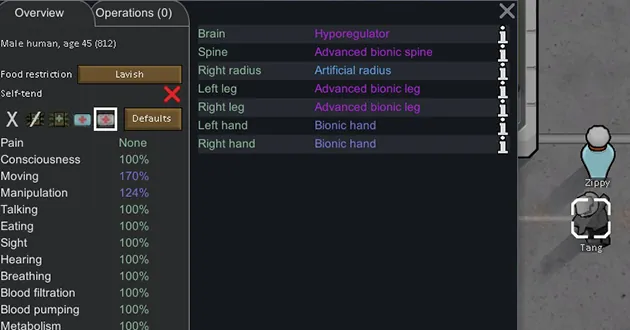 Your colonists will, however, struggle for a while if they lose limbs or become severely crippled in the early game, until you manage to craft the rare and expensive bionic parts. You can still make simple prostheses and repair shattered bones relatively fast after researching it, but the resource cost is quite high for most things. Peg legs, wooden feet and dentures are of course always available for free. ;-) Early colony life was never easy !