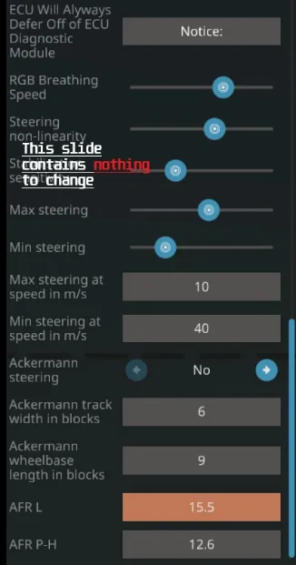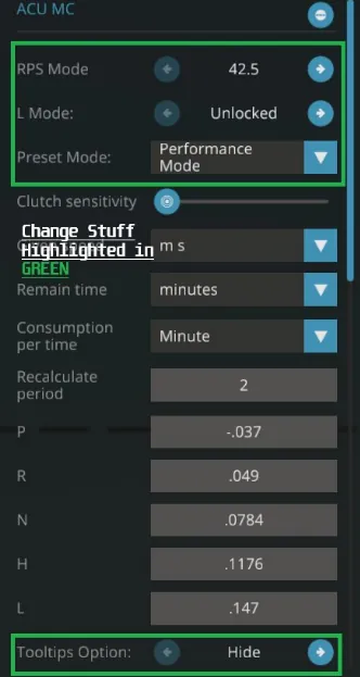 "P;R;N;H;L" in the ACU- Clutch sensitivity- "Given Speed; Remain Time; Consumption Time; Recalculate Period". Nor mess with "Wheelie Value Neutral". Nor "Speed to Allow Changing Engine Modes".