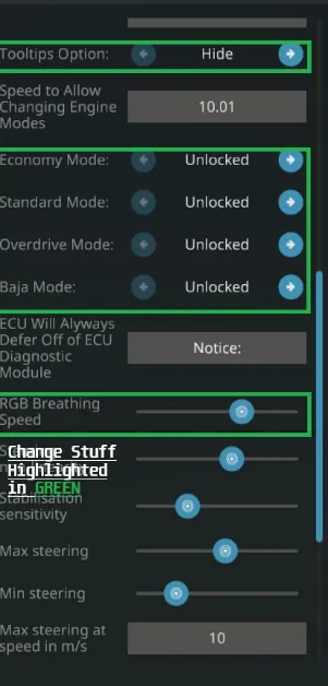 **These modes cannot be changed unless you spawn the EQC Module in, or take the ATV into the workbench and change the ECU modes there.