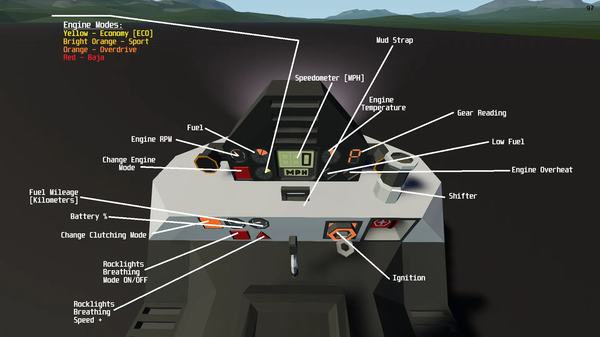 When spawned (unless locked) the ATV will automatically spawn in 'Economy Mode' [Yellow]. To change modes, click the "[b] Change Engine Modes [/b]" button, After one click, you should then be at 'Sport Mode' [Bright Orange]. Click again to go into 'Overdrive Mode' [Dark Orange]. Then, again, to go into the last, and final mode: 'Baja Mode' [Red].