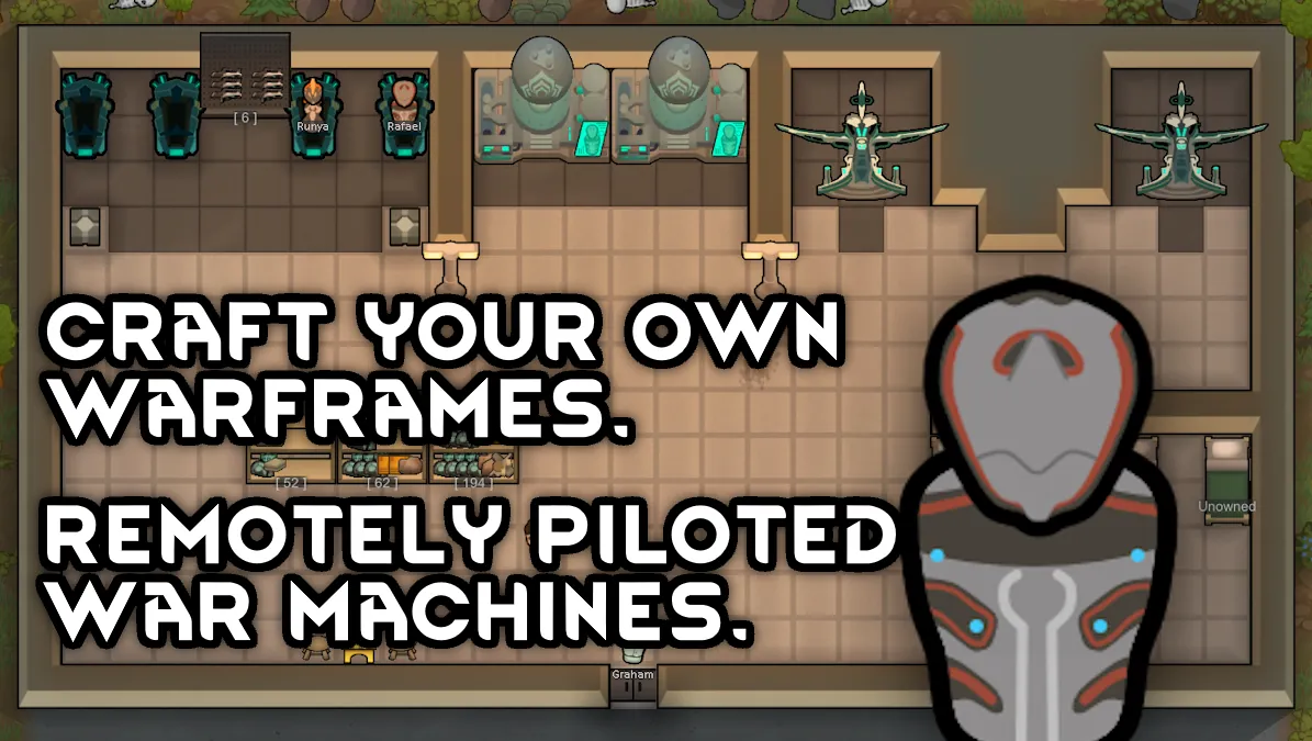 This mod adds lots of Warframe stuff to your game. New weapons. New armor. New pawns (Warframes!). New buildings. New factions. New resources. Lots of new stuff.