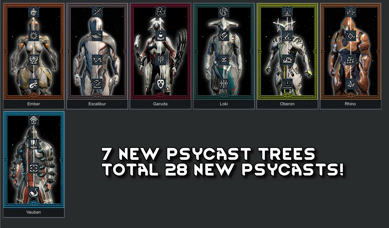 Adds 7 brand new Vanilla Psycasts Expanded psycast trees to Rimworld, based on different warframes from the game, Warframe.