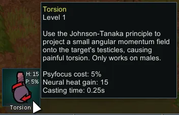 Adds a testicular torsion psycast. That's all. It can only target male pawns, causes high pain, and if not fixed via a special (but simple) procedure within 12 hours, the targeted pawn will become sterile and get an infection.