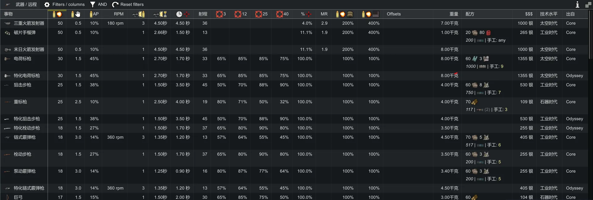 该 Mod 添加了新选项卡“Stats”(统计),其中包含不同类型物品的数据统计表。将鼠标悬停在“i”图标上可查看控件指南。 控件指南: -按住(左键)并将移动鼠标光标水平滚动。 -按住[Ctrl]并单击列要固定/取消固定的名称 -按住[Ctrl]并单击一行固定/取消固定 -您可以固定多行。 -固定行不受过滤器的影响。 所有列都是可筛选和可排序的。 原mod只有小部分是中文故作补充翻译。作者留的翻译接口有限,有些标签是图形化的无法翻译但鼠标停滞其上可见中文说明。