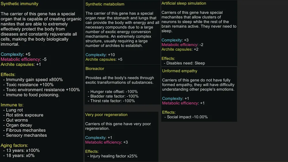 This mod adds 5 xenogenes for this xenotype. An attempt was made to make them a bit more balanced.