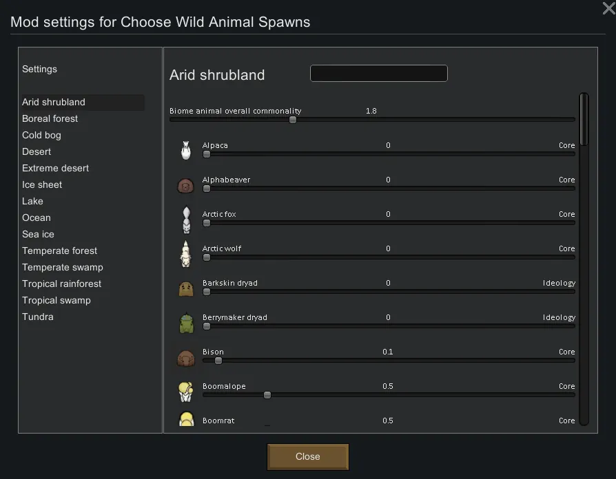 [url=https://steamcommunity.com/sharedfiles/filedetails/changelog/2564042934][img]https://img.shields.io/github/v/release/emipa606/ChooseWildAnimalSpawns?label=latest%20version&style=plastic&labelColor=0070cd&color=white[/img][/url] | tags: biomes