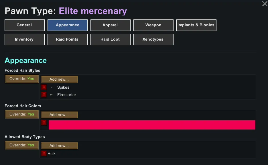 - Specify role names, apparel types, hair types, weapon types, set colors, change caravan animals and more per pawnkind per faction