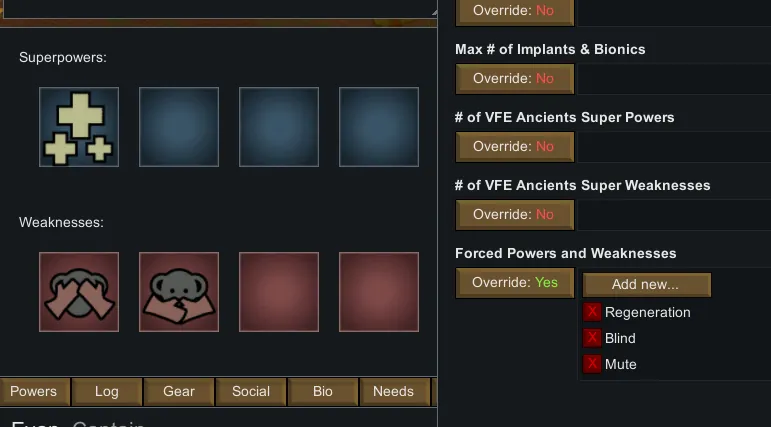 [*] Customising VFE Ancients Superpowers if you have the [url=https://steamcommunity.com/sharedfiles/filedetails/?id=2654846754]VFE Ancients[/url] mod.