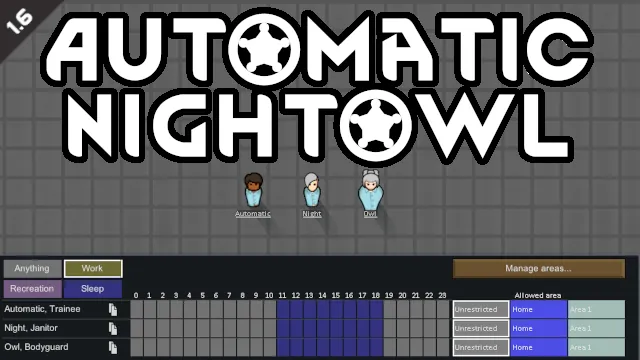 Automatically assigns the sleep schedule for starting, newly recruited, and PrepareCarefully pawns with the night owl trait.