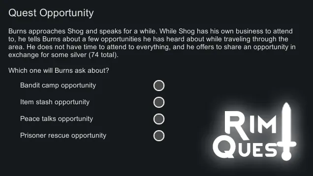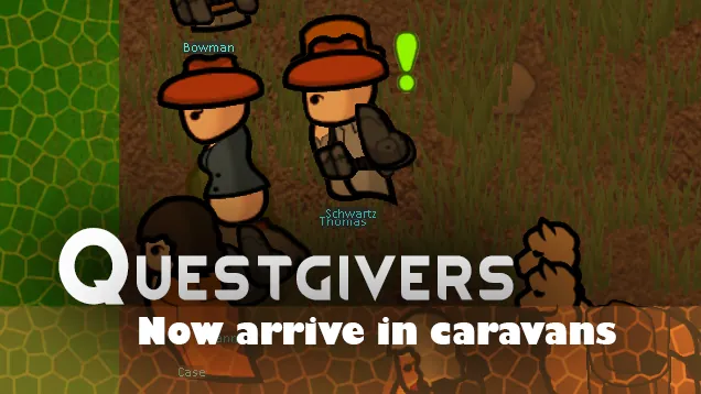 Adds quest givers to trader groups and caravans. This mod exists for those of us who feel that RimWorld could use a little more direction from time to time, and a good quest is just what we need!