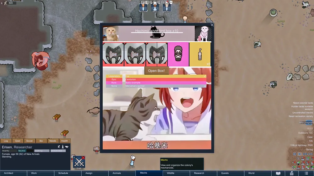 The idea and basic design of the loot box are originally from the mod LootBoxes - Rimworld Surprise Mechanics by OniJechto. The original mod scans through the game's defs and sets a mathematical curve to pick potential prizes based on their market values. This might not work very well for a heavily-modded game where hundreds of thousands of modded items may exist, and some may even have strict restrictions. Also, it does not include pawns as rewards. So, I rewrote the mod to allow a smaller pool of prizes and added many more functionalities to make the loot box more immersive and enjoyable.