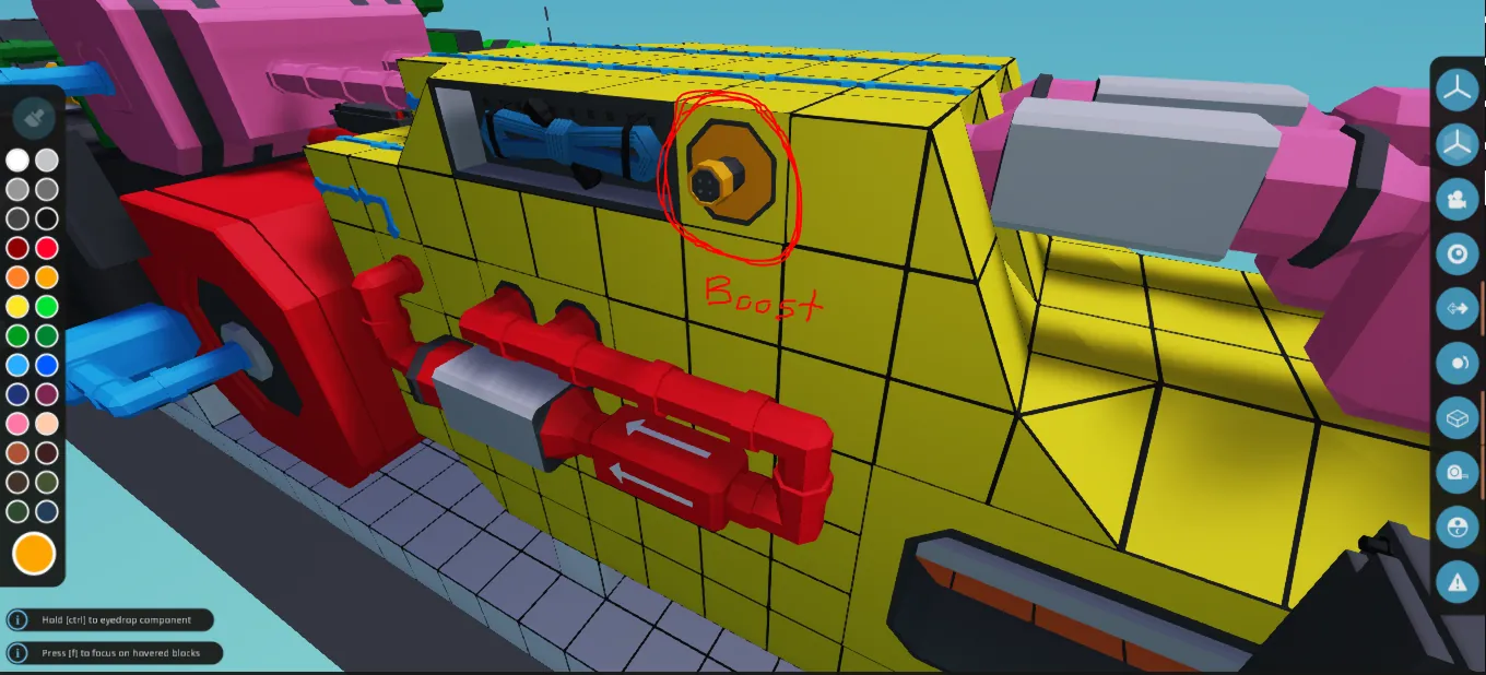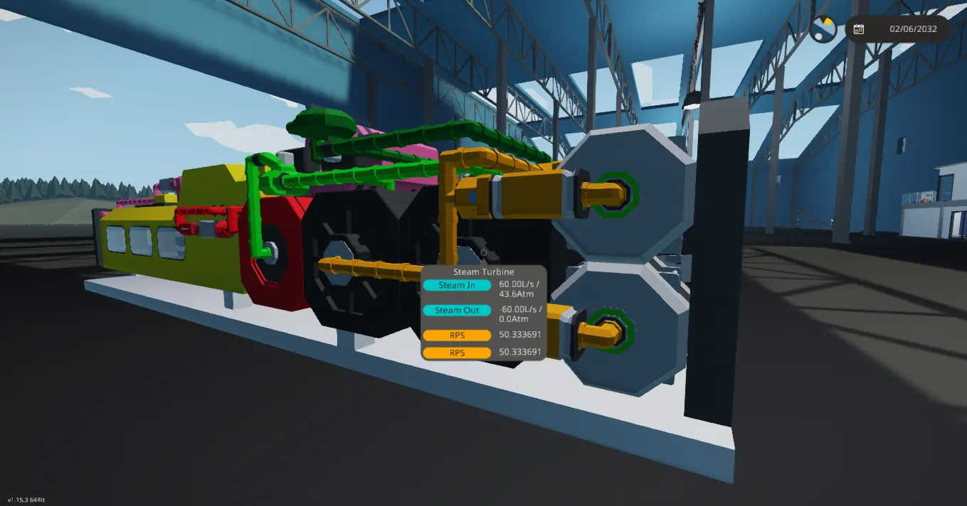 Well, the system now functions at the most economical steam flow of 60 l/s. In addition, the single generator design has been swapped out for a quad-output system that uses a clutch-based controller to get the most bang for your buck out of each generator. The single turbine has been swapped out for a double-turbine design, and the reactor has been slimmed down quite a bit. The reactor's power system has also been completely separated from it's generator output, preventing your builds from draining the power the reactor needs to operate. I have also installed a "boost" port. This port isn't to boost other vehicles, it's to power the systems of the nuclear reactor just in the event something drains the core battery to a point where it can't heat up.