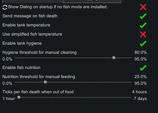 Can't be bothered with juggling comfortable temperatures? Don't want your haulers to get bogged down with hauling fish food? Don't like dirty water? Just use the settings to disable and tweak the main features that come with this mod.