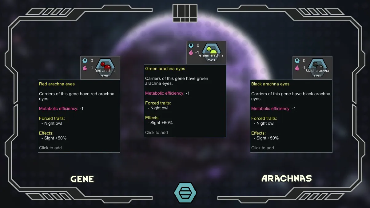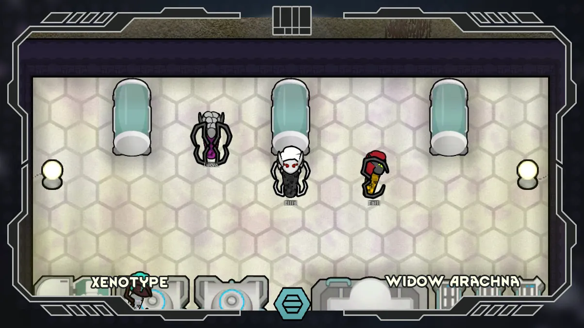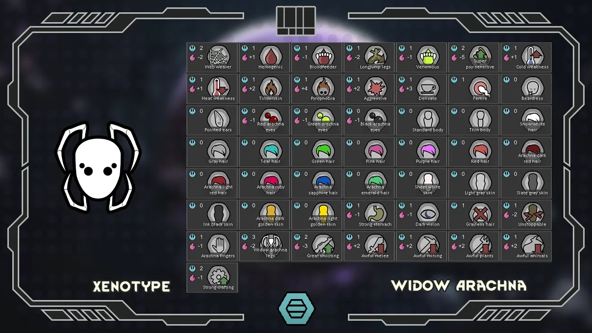 Successful result of research to recreate and insertion of genes that imitating the powers of the divinity by the Crimson Arachna Cult. The main feature of the Arachna xenotype series is the presence of several pairs of additional arachna legs, which improve their movement and manipulation, a gland capable of releasing a dangerous neurotoxin, secreting a sticky web with which they can stun and slow down enemies. Arachnas are nocturnal, very aggressive, warlike but weak to temperature extremes and fire.